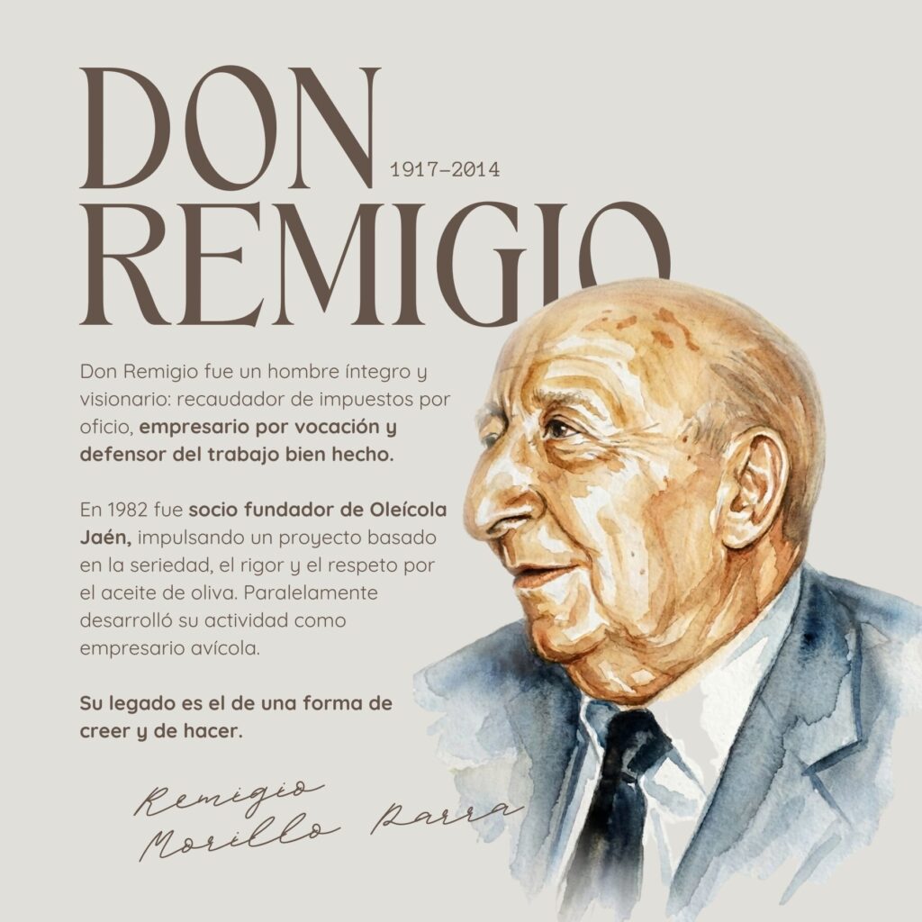 Don Remigio, recaudador de impuestos de profesión y empresario por convicción, fue socio fundador de Oleícola Jaén en 1982, en una etapa de profunda transformación del olivar en la provincia de Jaén. Su figura representa a una generación marcada por el esfuerzo silencioso, la responsabilidad y una visión a largo plazo, en la que el progreso era consecuencia del trabajo bien hecho.