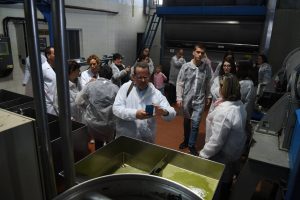 En la zona de fábrica observaron el proceso de molienda, donde cataron el recién exprimido zumo de aceituna extraído de las aceitunas directamente desde la centrifugadora. Además los trasladamos a nuestra su envasadora y su laboratorio, donde explicamos tanto el proceso de producción como de calidad que se sigue a la hora de la elaboración de los aceites tempranos y así como su clasificación en la bodega, dependiendo de la variedad y de su fecha de obtención.