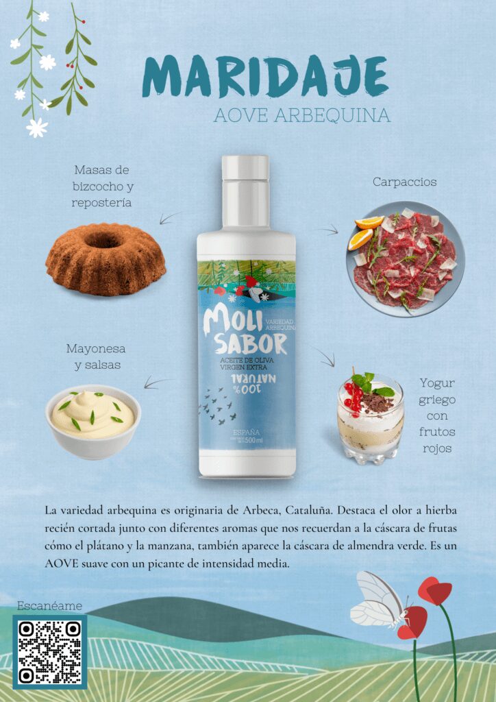 El AOVE arbequina de Oleícola Jaén lo embotellamos en nuestra marca MOLISABOR es valorado por su sabor suave y frutado, con notas a manzana y almendra, y por su bajo nivel de acidez. Además, se considera un aceite saludable debido a su alto contenido de ácido oleico y antioxidantes n
