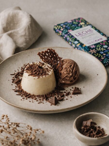Panna cotta con helado de chocolate con aove y leche merengada
